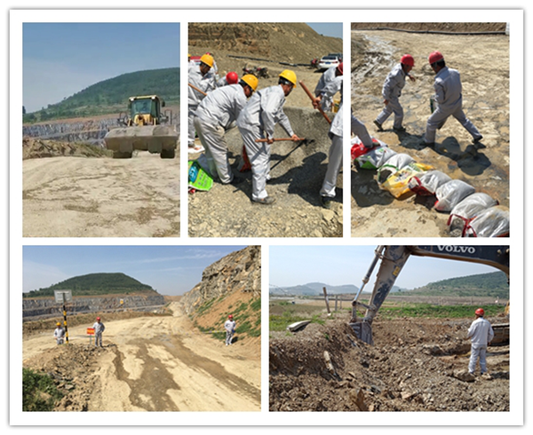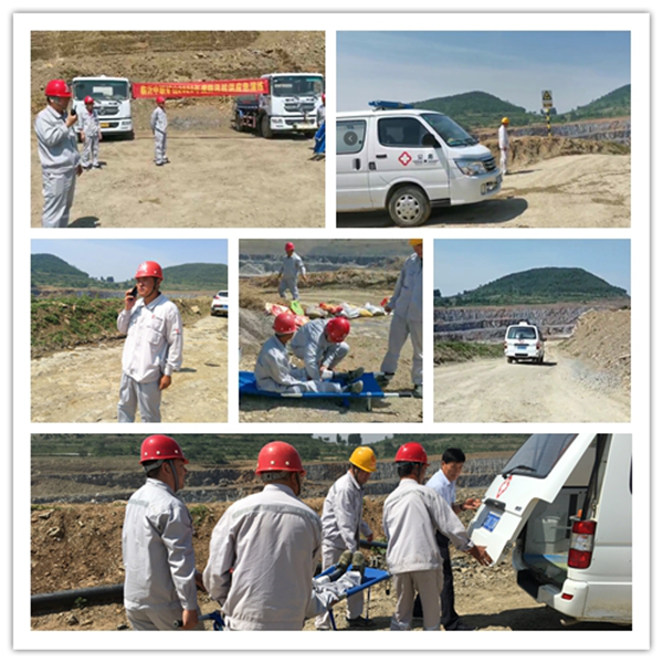 演練正式開始后,在總指揮的統一管理、協調指揮下,各職能小組根據各自的職責分工,有條不紊的開展應急搶險工作。物資保障組全力提供救援物資;通信聯絡組迅速聯系醫療救護單位、報告上級部門;醫療救護組做好醫療救護準備,一旦有人員受傷,根據傷情進行救治;疏散警戒組負責坑下車輛及設備疏散撤離及路口警戒;應急救援組及時疏通水道,向防洪堤壩外疏通, 啟動排水設備,排出采坑積水,運輸沙土,裝沙袋筑堤,防止洪水流入采區。