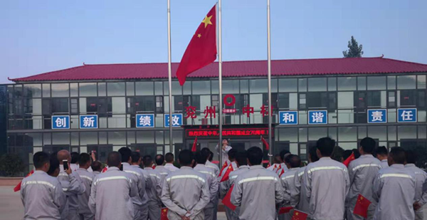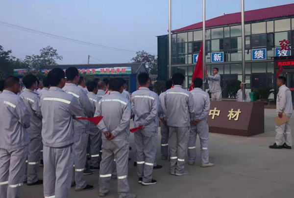 “全體肅立,行注目禮,升國旗,奏唱國歌!”伴隨著嘹亮的國歌,五星紅旗冉冉升起,兗州中材蘭陵分公司全體人員,莊嚴肅靜,目光隨著紅旗升高。旗升至頂,全體人員注目禮畢,高呼“我愛你中國,祖國萬歲”。