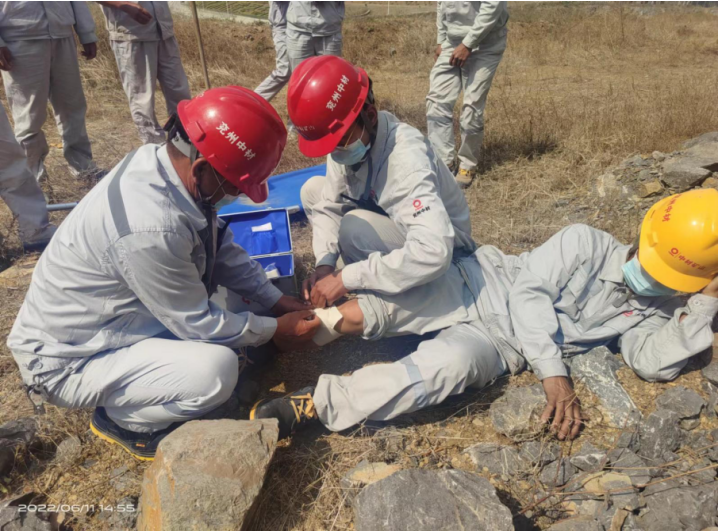 本次演練主要是模擬邊坡坍塌人員被砸傷的情景,演練開始,首先由現場工作人員按照預案進行事故上報,接著現場負責人王海生安排所有作業人員和設備撤離現場并上報應急指揮小組,副組長龔士朋在接警后向組長魯臣匯報情況后請示啟動應急救援預案,組長魯臣下達指令:“立即啟動應急救援預案!”副組長龔士朋迅速組織通信警戒組、搶險救援組、物資保障組等按照各小組的分工與職責,趕赴現場展開救援,轉移受傷人離開險境,緊急處理傷員傷勢并與現場等候的120急救人員協力送醫救治,圓滿完成各項演練任務。